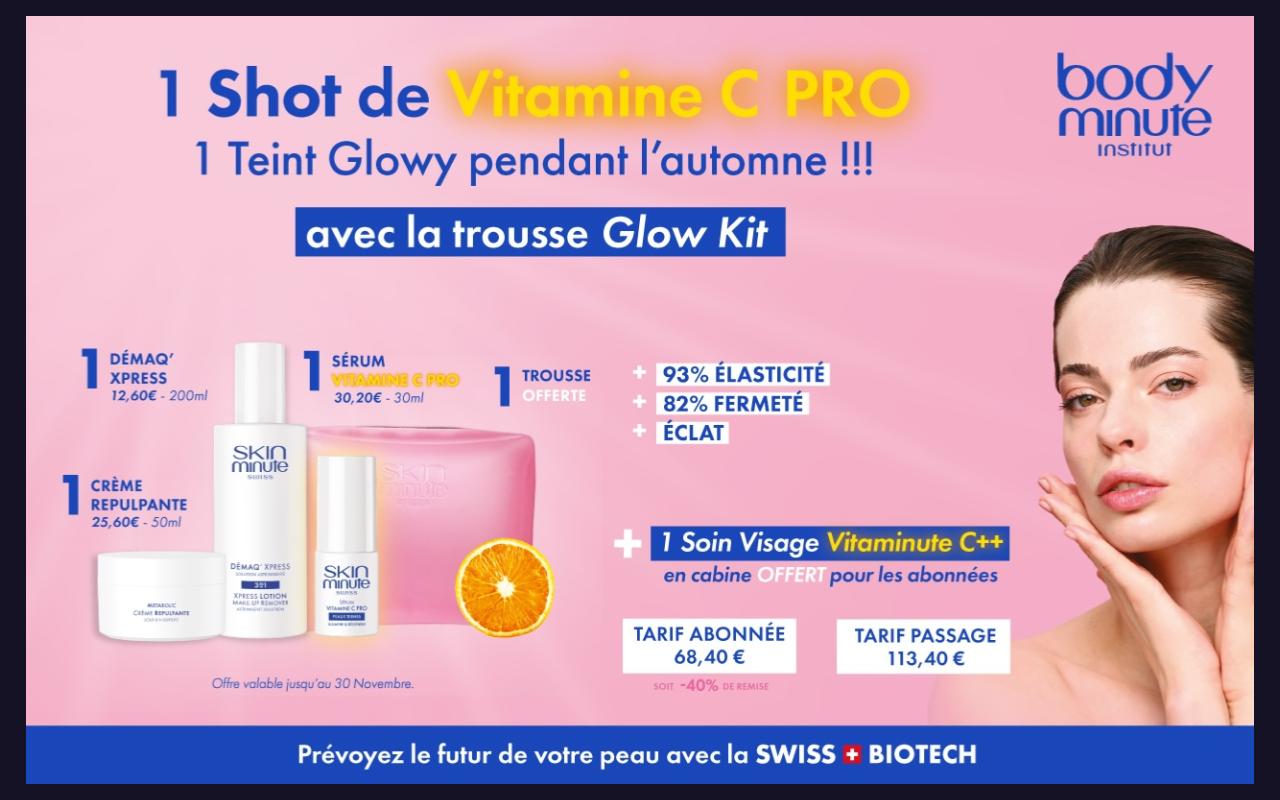 1 Démaq'xpress + 1 Crème repulpante + 1 Sérum vitamine C Pro = 1 trousse et 1 soin visage Vitaminute C++ en cabine offerts*
