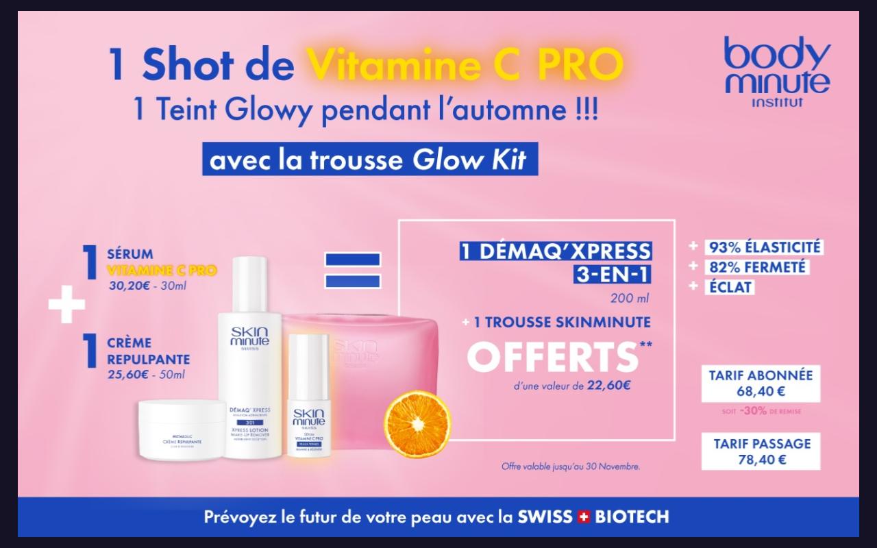 1 Sérum vitamine C Pro + 1 Crème repulpante = 1 Démaq'xpress et 1 trousse Skinminute offerts*